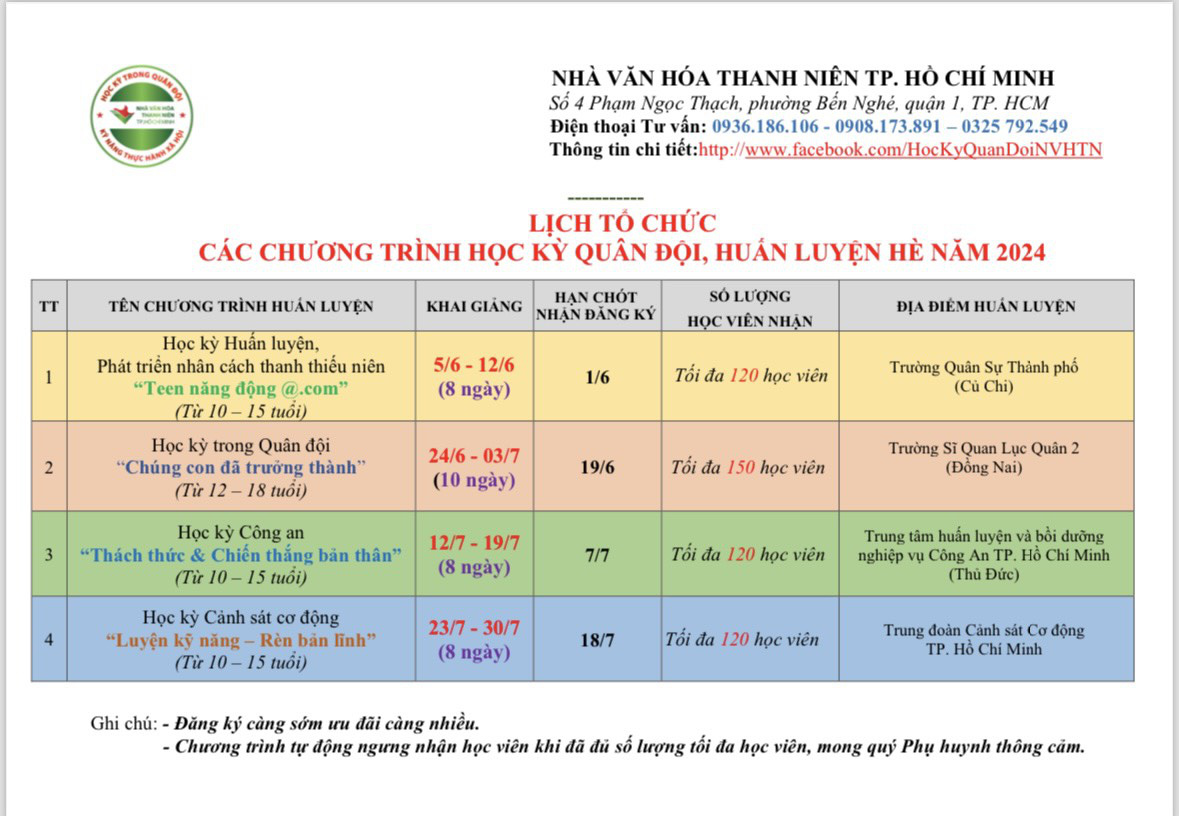 Nhà văn hóa Thanh niên TP.HCM đã đưa ra 4 chương trình Học kỳ Quân đội, huấn luyện hè năm 2024.