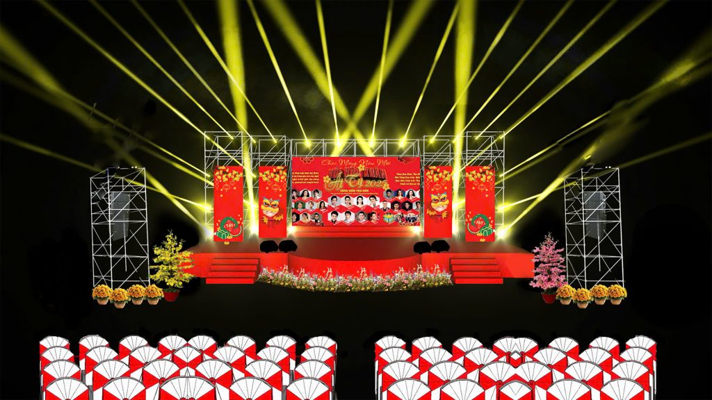 - Sân khấu lắp ghép, bục phát biểu, phông nền (backdrop) thể hiện chủ đề sự kiện.